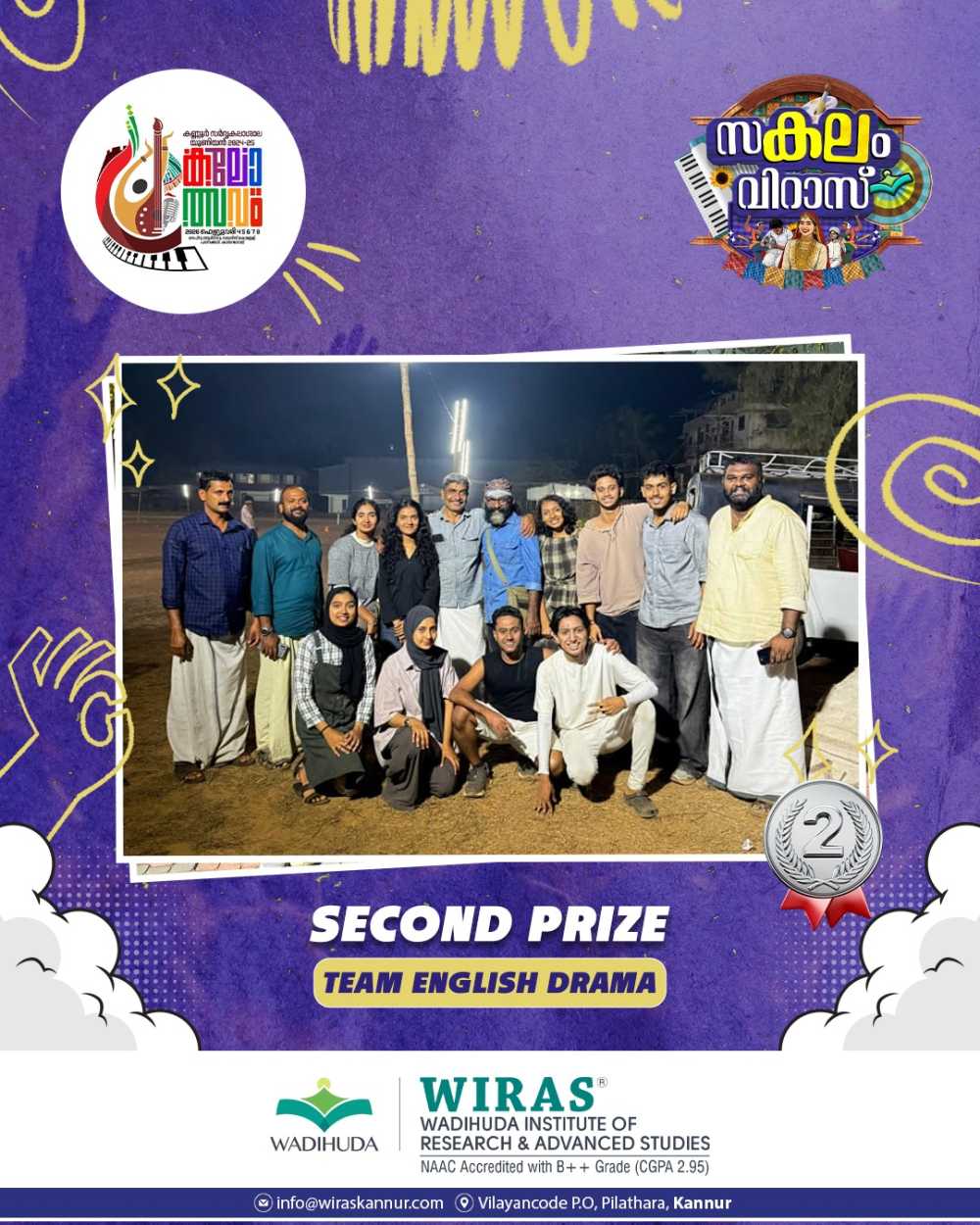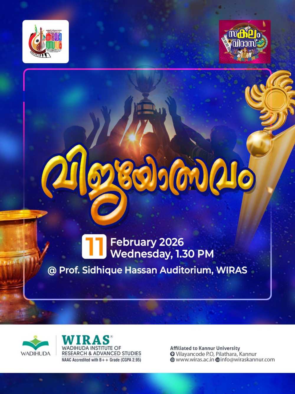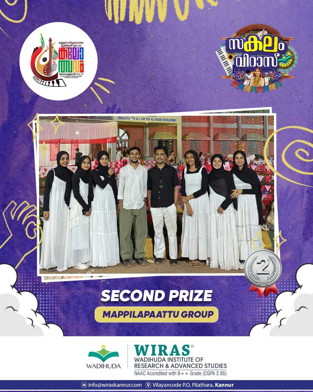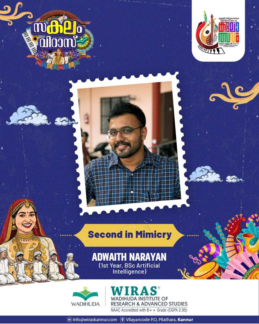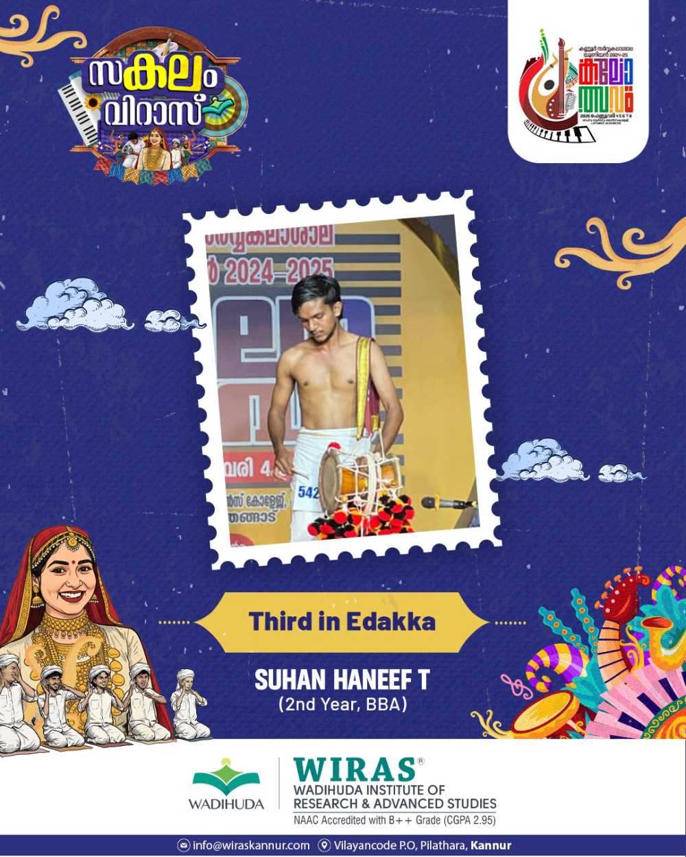 Abhirami V P, a third-year BSc Psychology student of Wadihuda Institute of Research and Advanced Studies (WIRAS), secured First Prize in Thirakadharachana (Malayalam) at the Kannur University Union Kalolsavam. Her achievement reflects her literary talent and dedication, bringing pride to the institution. The management, principal, faculty, and students of WIRAS congratulated her on this accomplishment and wished her continued success in future endeavors.